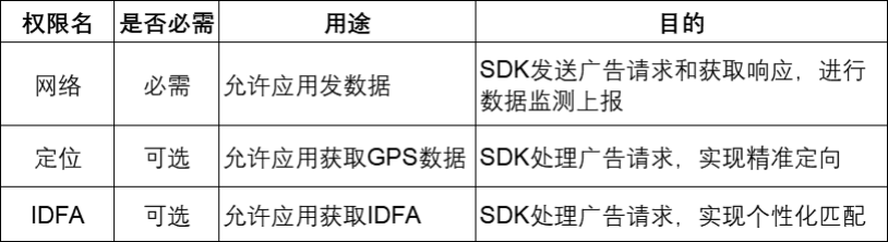 • 基础功能:在开发者应用中进行广告投放,包括广告展示、广告监测、广告归因、广告效果优化,以及应用程序运行过程中的启动、关闭、广告曝光、点击等用户行为数据监测。